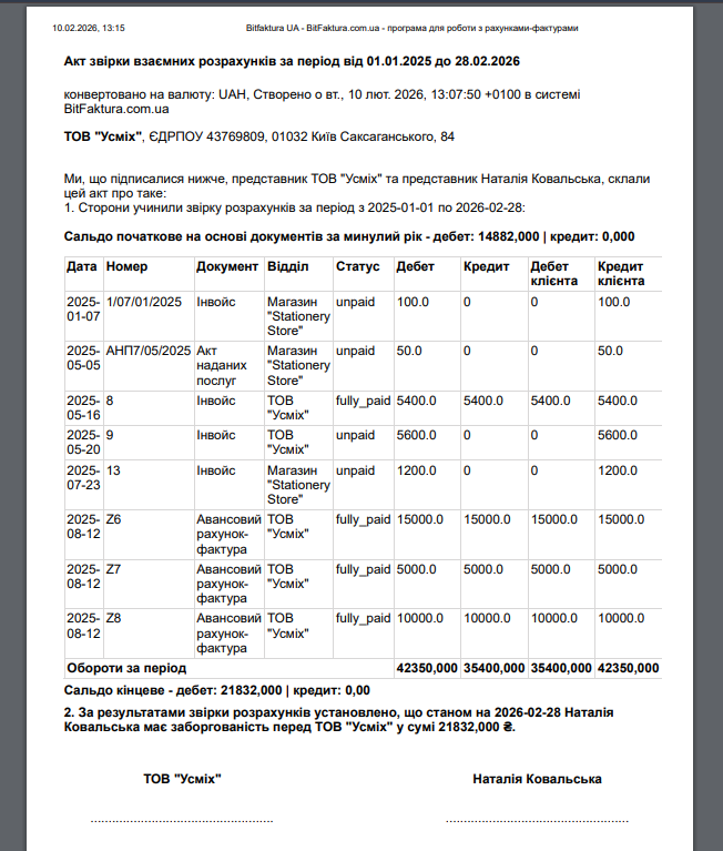 Акт звірки взаєморозрахунків допоможе вам швидко перевірити, які документи вже оплачені, які залишаються неоплаченими, а які — частково оплачені. Звірка в BitFaktura базуватиметься саме на статусах документів, тож ви одразу побачите реальний стан розрахунків із клієнтами та постачальниками.